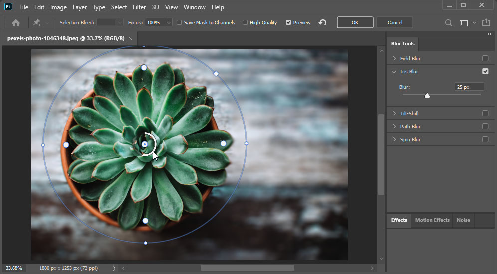 - Iris Blur creates a field that blurs everything outside it. Its blur pin has more gadgets around it that define that field’s size, shape and smoothness of transition into blurriness.